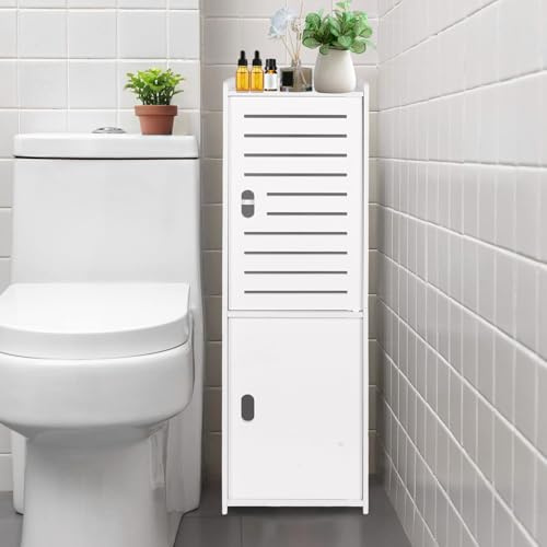 SMIBUY Bathroom Storage Shelf with Cabinet, Bamboo Over-The-Toilet Organizer Rack, Freestanding Toilet Space Saver with 3-Tier Adjustable Shelves (White)